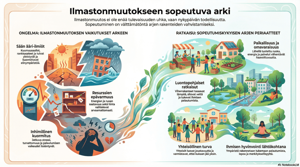 Ilmastonmuutos ei ole tulevaisuuden uhka, vaan nykyinen lähtötilanne. Sää äärevöityy, huoltoketjut katkeilevat ja arjen ennakoitavuus heikkenee. Tässä tilanteessa tärkein kysymys ei ole vain, miten päästöjä vähennetään, vaan miten arki järjestetään niin, että elämä pysyy toimivana ja inhimillisenä myös muuttuvissa oloissa.